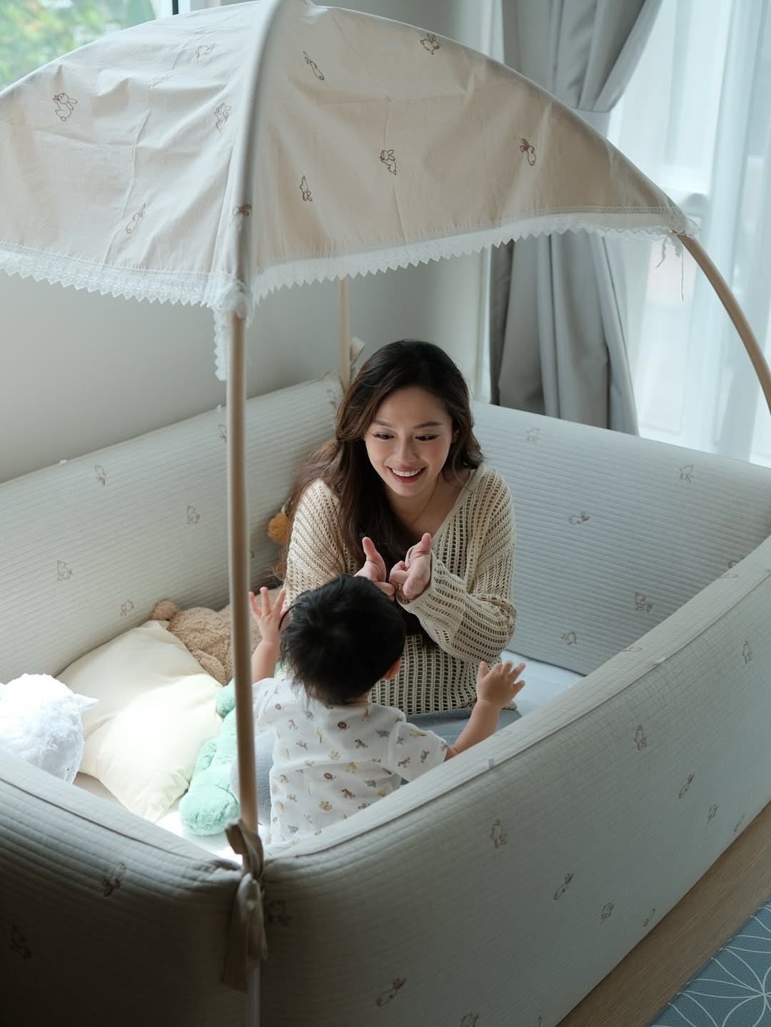 LOLBaby Cotton Embroidery Bumper Bed with Hanging Toy and Canopy - Cherry Beige (Pre Order Feb 2026)