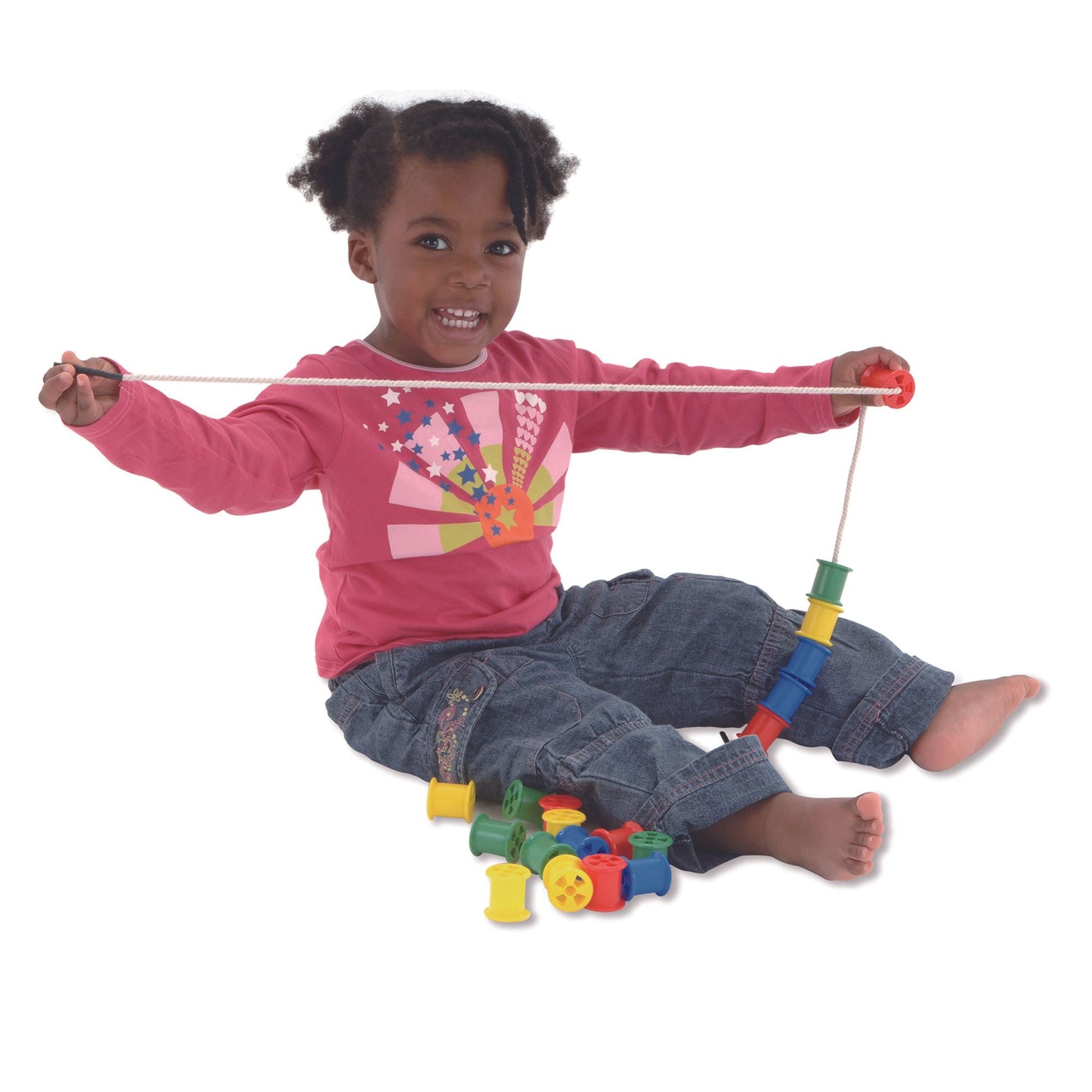 Set of 20 cotton reels in 4 bright colours plus a chunky threading cord. Ideal for threading and stacking to encourage hand-eye coordination and manual dexterity. Progress to colour sorting and counting with this versatile toy. Made from tough, durable plastic.