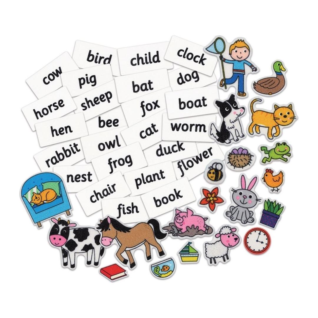 Children will love learning their first words as they stick the felt pictures and words to the fun felt scenes. Each of the colourful felt pieces has a felt word to match to it. The felt pieces and words are reusable and easy to remove for young children. Ideal for travel, this fun activity will stimulate your child's imagination and encourage language development and early literacy skills.