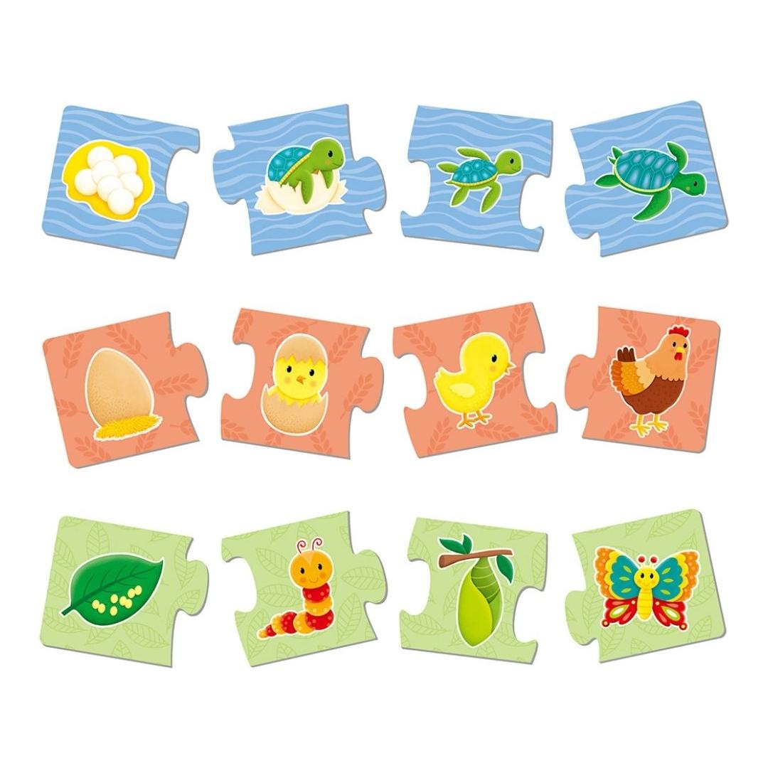 Set of 6 colourful 4-piece puzzles showing the life cycles of a variety of