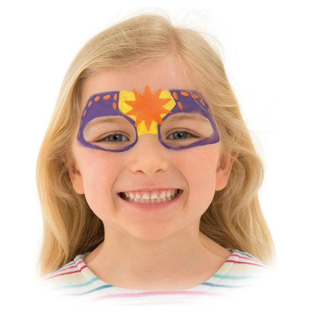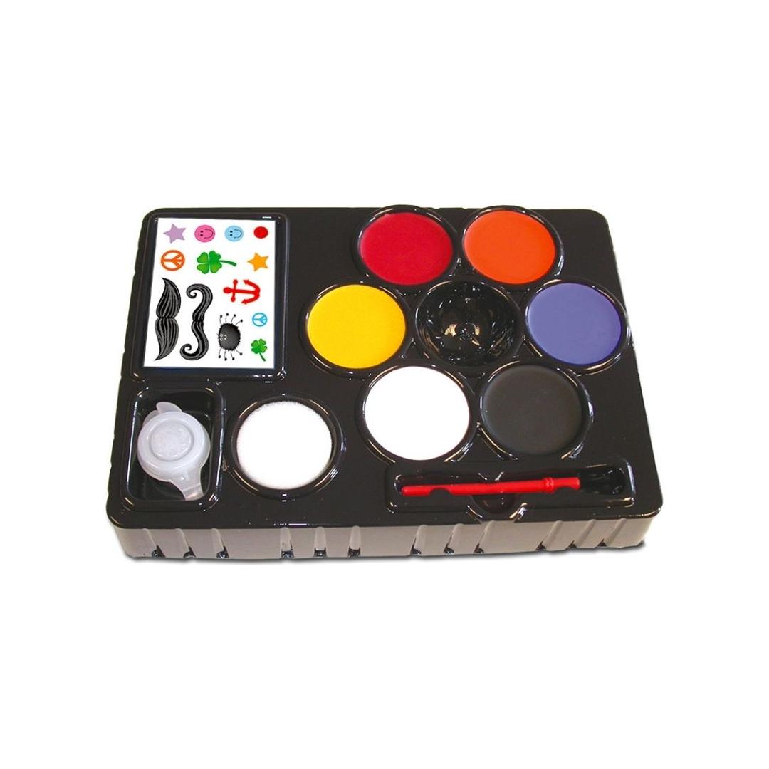• Palette with 7 colour face paint discs, adhesive stencils, brush, 2 sponges and guide.