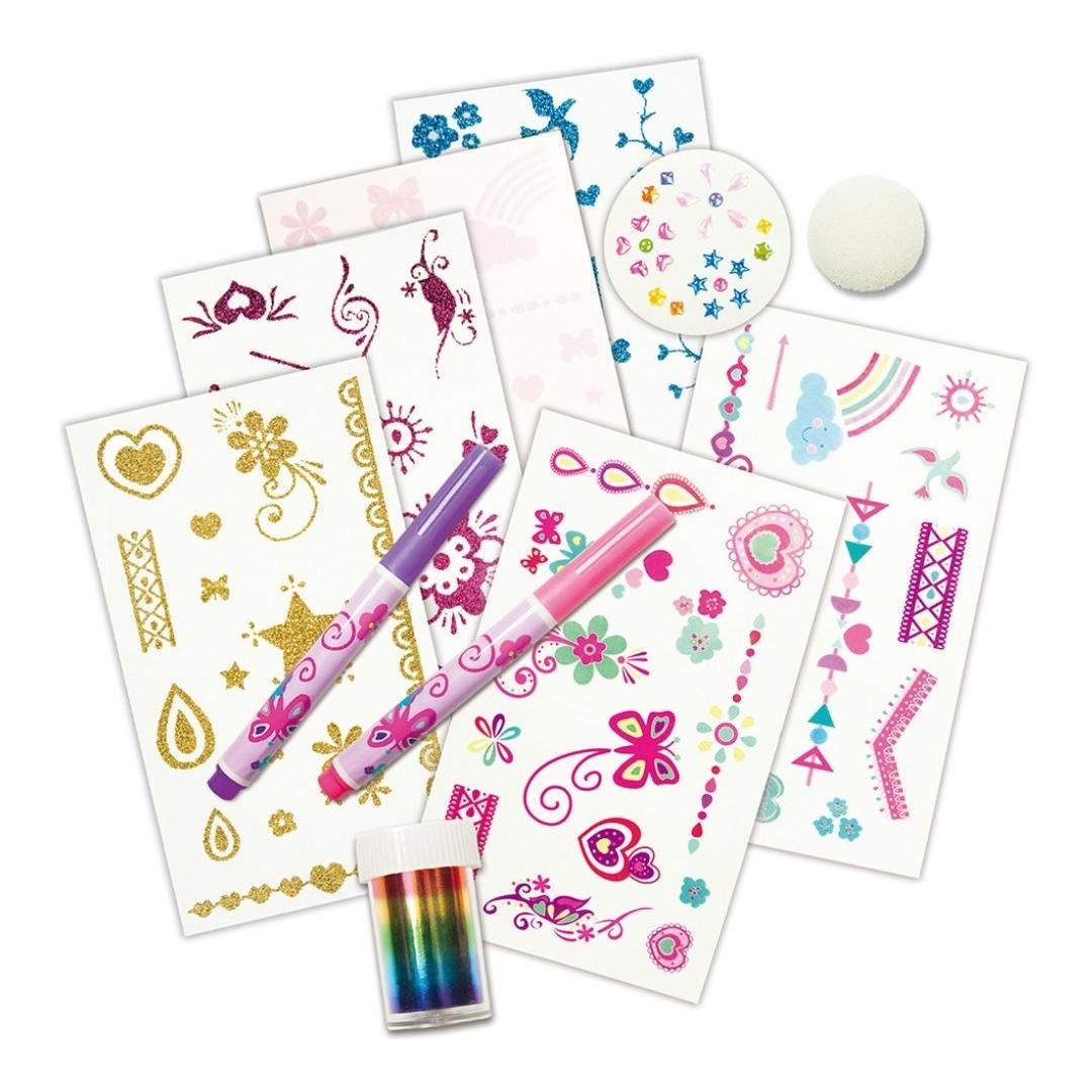 • 4 glitter shaker tubes and rainbow tattoo foil with 4 sheets of sticky tattoo transfers, 2 sheets of glitter tattoo transfers, pink body art marker, stick-on gems, sponge and guide.