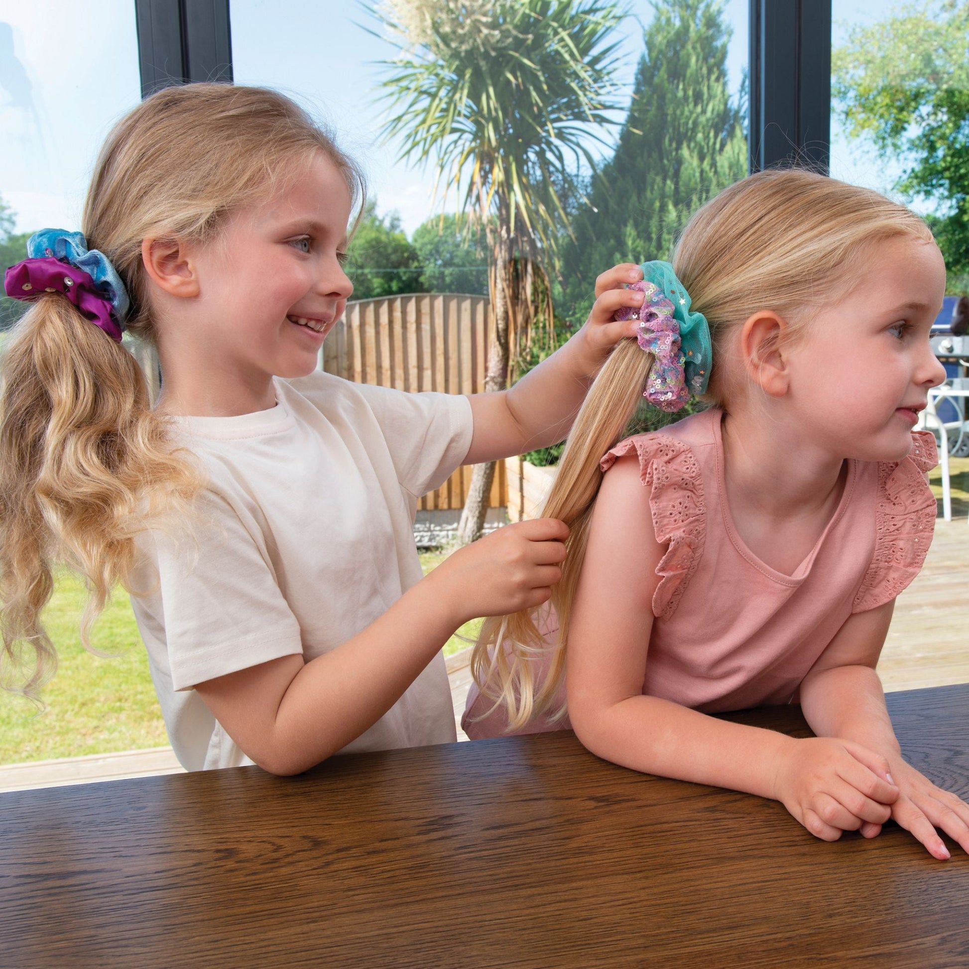 Create 5 scrunchies using the scrunchie making tool and colourful fabric scrunchie tubes. Decorate with pompoms and sequins for extra sparkle.