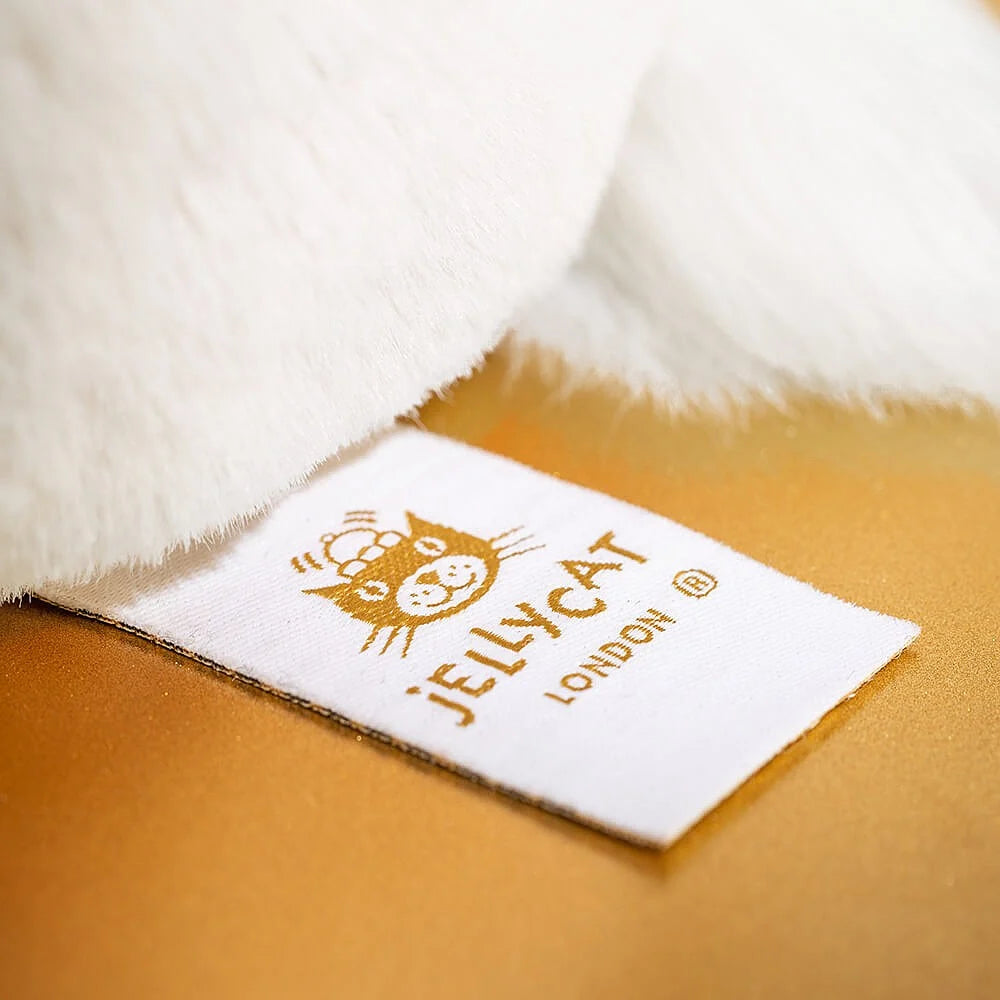 Bashful Luxe Bunny Luna is the dreamiest snow angel. This cloud-soft bunny has snow white fur, marshmallow paws and a glittery gold nose. A peaceful friend with long fold ears, Luna brings soothing Christmas cuddles.
