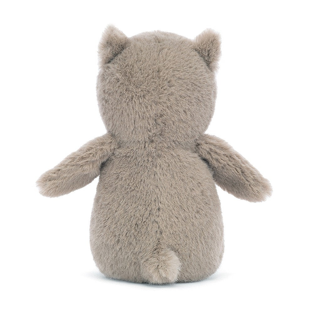 Nippit Owl is a curious bird who sits up tall to see what's going on. Cosy in taupe and soft as a cloud, with diddy tufts, flappy wings and suedey mustard feet and beak, our gentle owl perches high in the trees, looking down at the world below. The woodland is full of wonders!