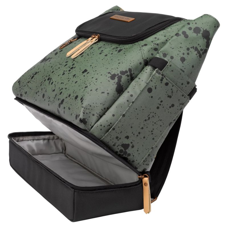 Backpack or Tote? The Pivot gives you both! The clever carrying strap easily pivots from back pack straps to over the shoulder. With thoughtfully placed pockets and insulated compartments, this flexible diaper bag easily converts to the whims of any adventure, from backpack to tote, playground to office, or small snacks to larger lunches. A bold print with a touch of playfulness, your bag in Olive Ink Blot is a head-turner. Styled on coated canvas, it has the look of leather, but is easier to take care of, hard-wearing, and stain-resistant. Naturally water-resistant and easy to wipe clean. Perfectly paired with real leather accents and metal hardware.