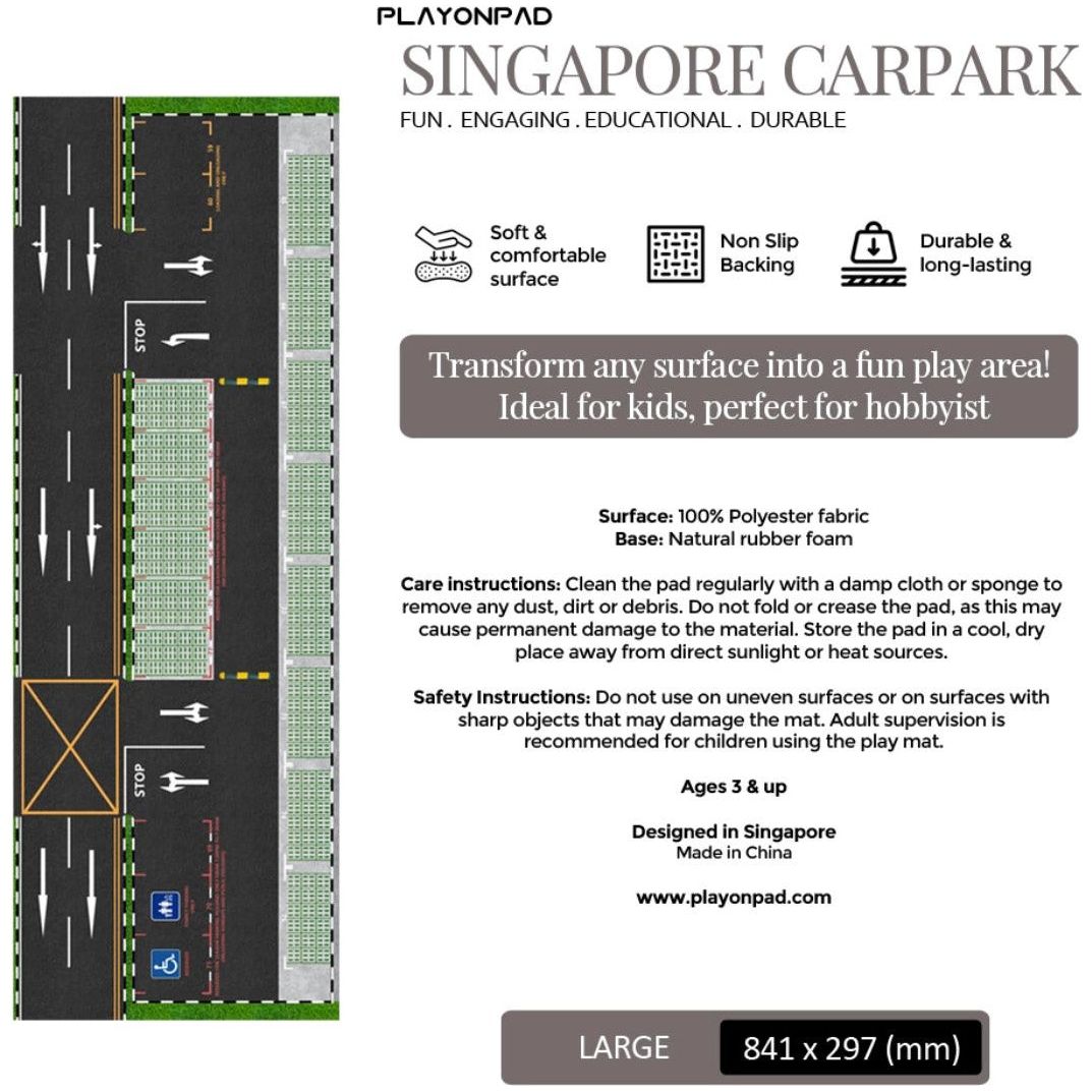 PLAYONPAD playmat is constructed with high-resolution details, based on Singapore's roads and car parks, to provide an immersive and realistic playing experience for children. The playmat is made from premium quality soft mouse pad material, making it safe for children to play within a confined area, and minimizing damage, paint scratches, and unintended dents to their favorite toy cars.
